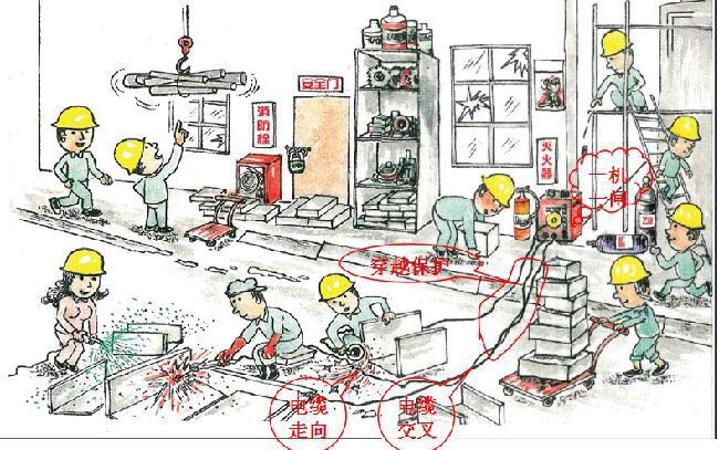 2、在必須橫跨道路或有重物擠壓危險的路段,需將相應線路穿硬管保護,硬管必須固定;當位于交通繁忙區域或重型設備經過的區域時,應用混凝土件對其進行保護,并設置安全警示標志 ; 3、電纜走向會被打磨發出的火花損壞; 4、電焊線交叉。
