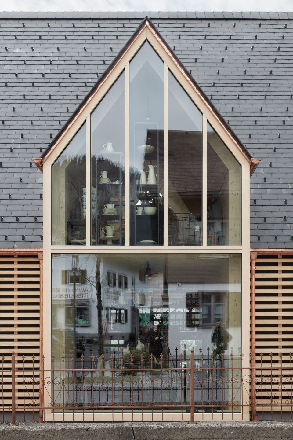 建筑師在原先主樓的庭院中加建了小型空間,與主體建筑共同形成了商店的前院。從這里可以看的落地櫥窗,隱約出現在視野中的商品將客人引入建筑內部。園藝工具和裝飾品展覽區位于建筑的一層,家居和餐具則被安排在了二層出售。房屋兩側的山墻參考了周圍村莊的設計方式。空間內部的十字形布局有著良好的功能分布,并且在外部形成特征鮮明的視覺體驗。