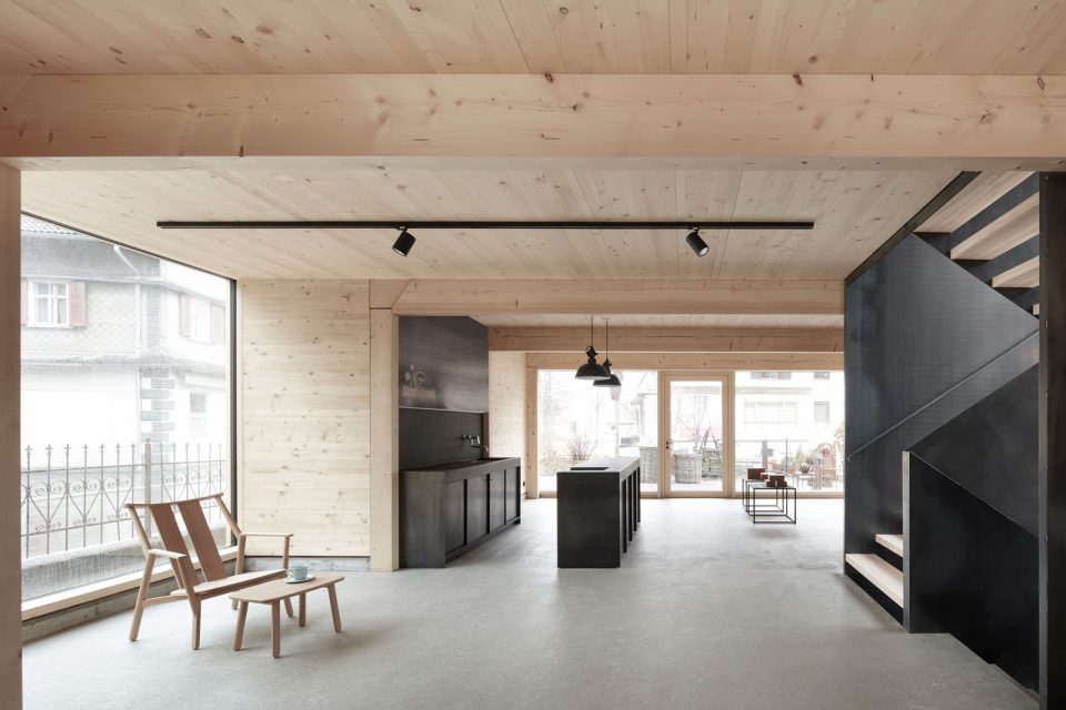 室內的特點是采用了大量的原木材料,并且保留了建筑內部的純粹的結構性設計。裸露的實木用簡單、精確的細節展示了工匠的技術。空間中的燈具和中央樓梯都采用了黑色的鋼結構設計突出了空間中展示的商品。內墻使用了云山木板飾面,冷杉木材料作為支撐結構。一層采用剖光的水泥地板,二層則使用了白蠟木鋪面,地板中還集成了一體化的地熱系統。相對于原先的工作坊來說,改造后的建筑為整個空間提供了簡單而純粹的感官體驗。