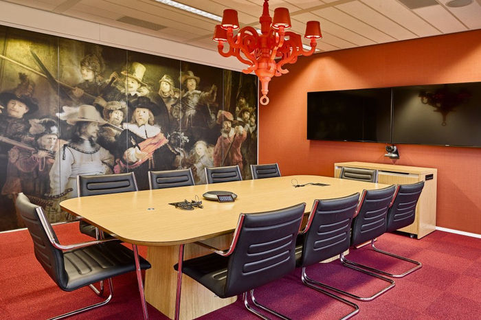 色彩已是人們擴充空間的常用元素。純度高、明度低、暖色調的色彩給人一種向前的感覺;而純度低、明度高、冷色調則給人一種后退的錯覺。因此,在辦公室裝修中可采用這后退色處理墻面,使空間看起來更大。